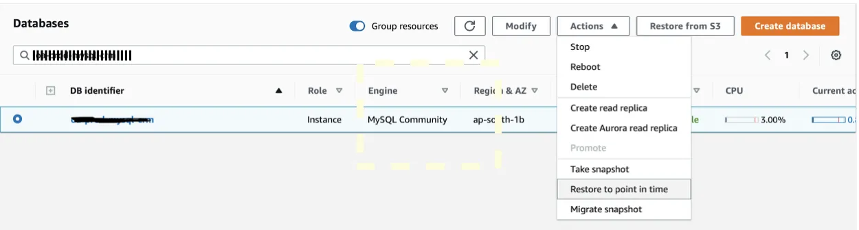 - Choose the instance below for which you need to do a point-in-time recovery