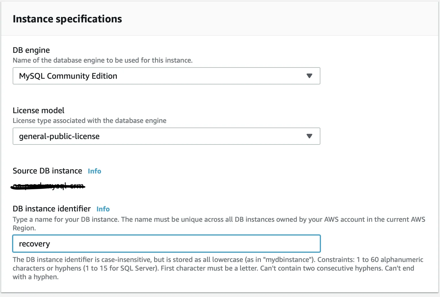 - Now proceed to chose a name for the instance i have made it as “recovery” engine type would be same as the source instance.