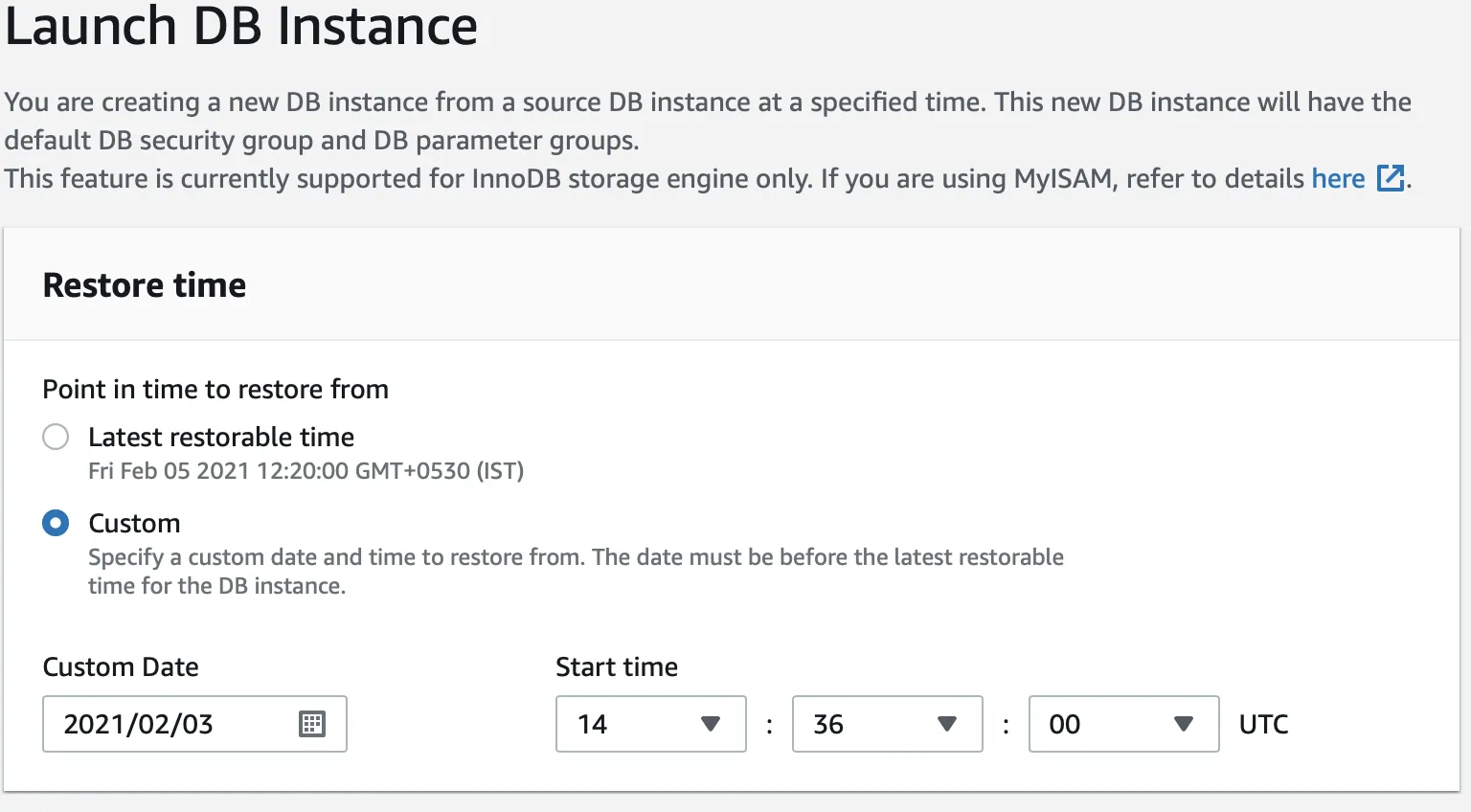 - Launch DB instance Wizard will appear as below, you can see “Last restorable time” defines the max time to which recovery is possible and “Custom” help you in choosing the custom time within the restorable window ie., within backup retention set