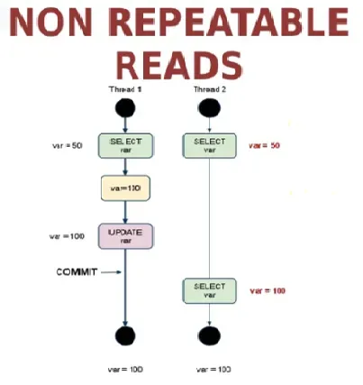 A non-repeatable occurs when a transaction performs the same transaction twice but gets a different result set each time. Suppose T2 reads some of the rows and T1 then change a row and commit the change, now T2 reads the same row set and gets a different result ie.., the initial read is non-repeatable.