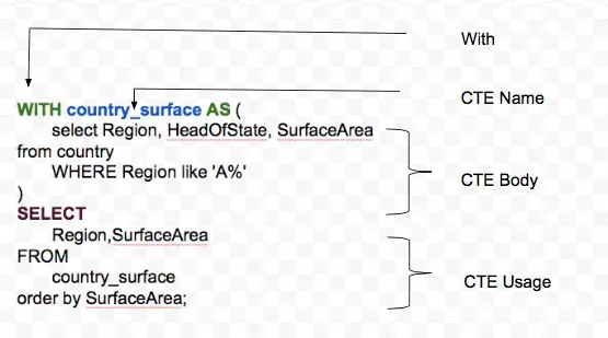 In this example name of the CTE is country_surface, the query that defines the CTE returns two columns Region and SurfaceArea.