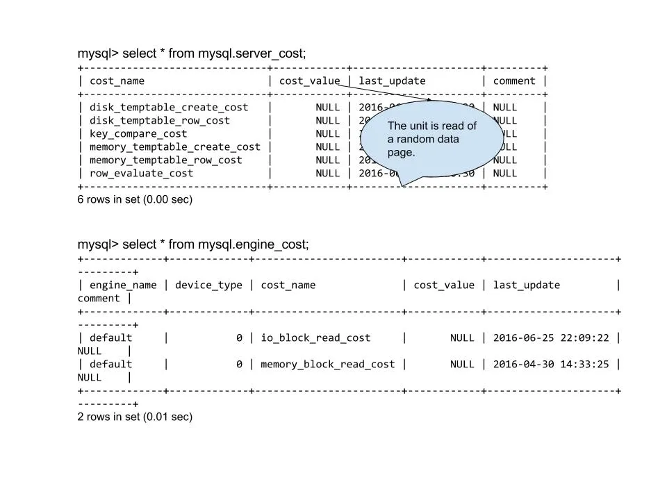 - These cost estimates are stored in server_cost & engine_cost tables in MySQL schema. For more details Cost Model