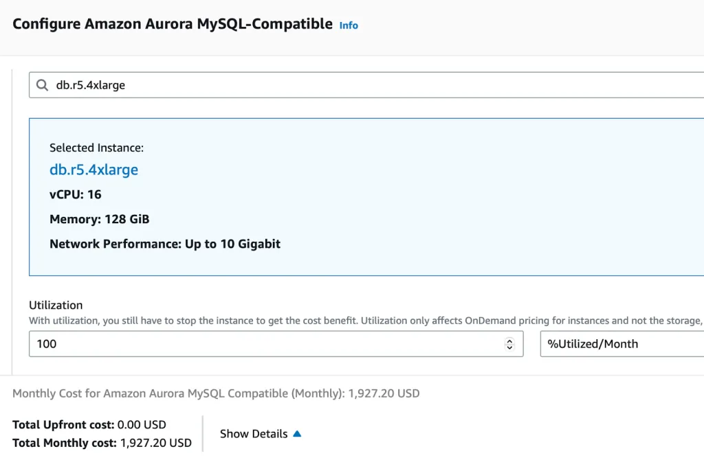 With Provisioned Aurora, 100% of the capacity is always available for use. The cost for the above instance is $1927.20.