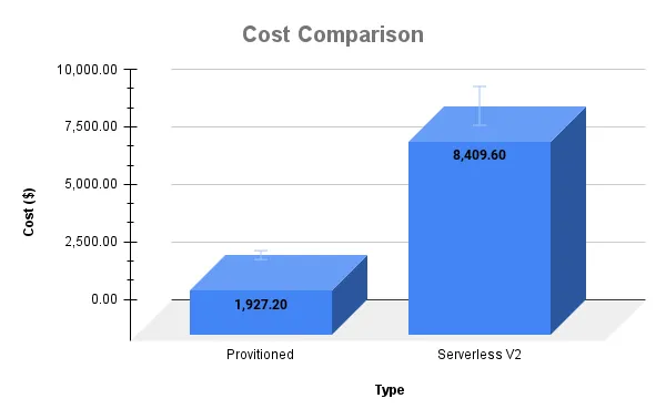 Serverless V2 costs $0.18 per ACU per hour, which is twice the cost of Serverless V1 ($0.09 per ACU hour). The cost for 128GB RAM with Serverless V2 is $8,409.60.