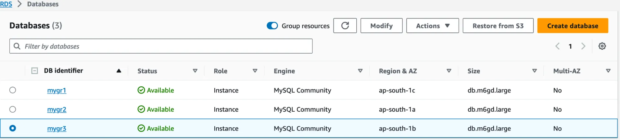 node 3: mygr3.cw4ye4iwvr7l.ap-south-1.rds.amazonaws.com