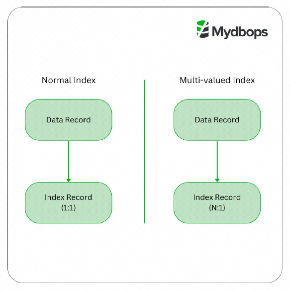 A Multi-Valued Index in MySQL 8.0 is a powerful feature that allows for efficient indexing and retrieval of data stored within JSON arrays. Unlike a normal index, which has a one-to-one relationship between index records and data records (1:1), a Multi-Valued Index enables a many-to-one relationship (N:1), where multiple index records can point to a single data record.
