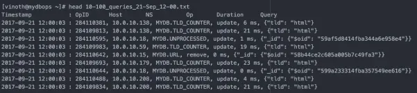 By default this utility saves / appends the information you see this screen in the file prefixed by the MongoDB hostname or the last two octets of the ip address and suffixed by the time (hour-min) we started the utility.