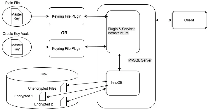 Innodb tablespace encryption uses two tier encryption architecture, in which it has master encryption key and Tablespace keys. The master key is used to encrypt and decrypt the tablespace keys whereas tablespace key is used to encrypt and decrypt tablespace data. Here the tablespace is very safe, as it is not viewable by any users.