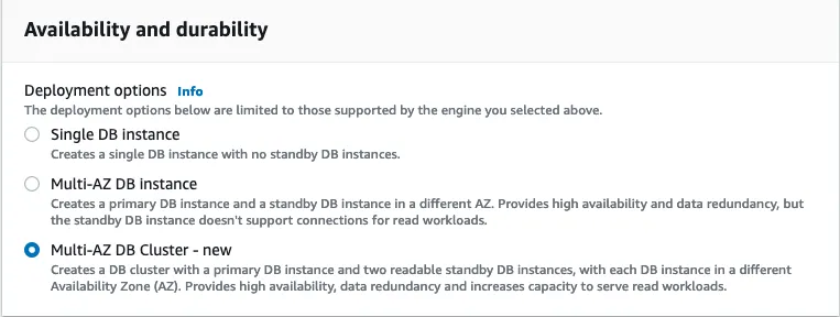 Under “Availability & Durability” choose “MultiAZ DB cluster” as below