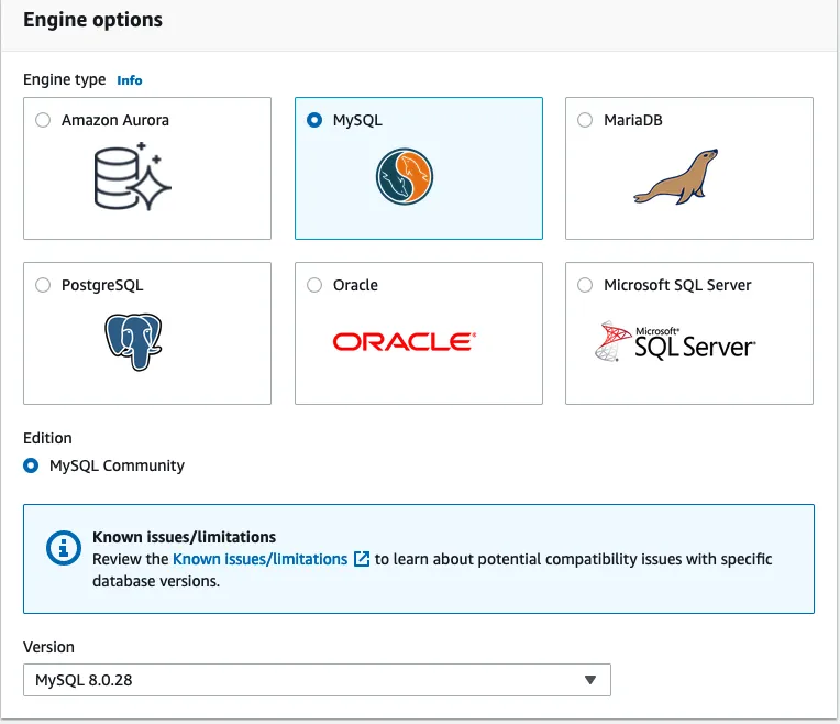 Hereunder the “Engine Option” am choosing “MySQL” and version as the latest “8.0.28”, Multi-AZ cluster is supported from version 8.0.26