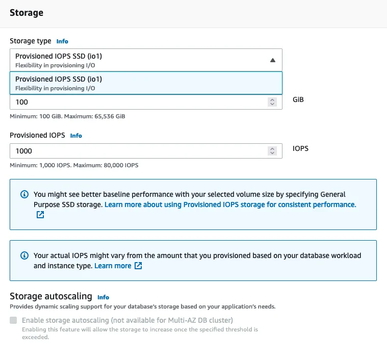 MultiAZ DB cluster accepts only the “Provisioned IOPS SSD(i01)” with a minimum storage capacity of 100G and a minimum of 1000 IOPS