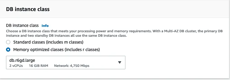 Am here choosing the lowest instance type for testing ie., db.r6gd.large(2vCPU & 16G RAM)