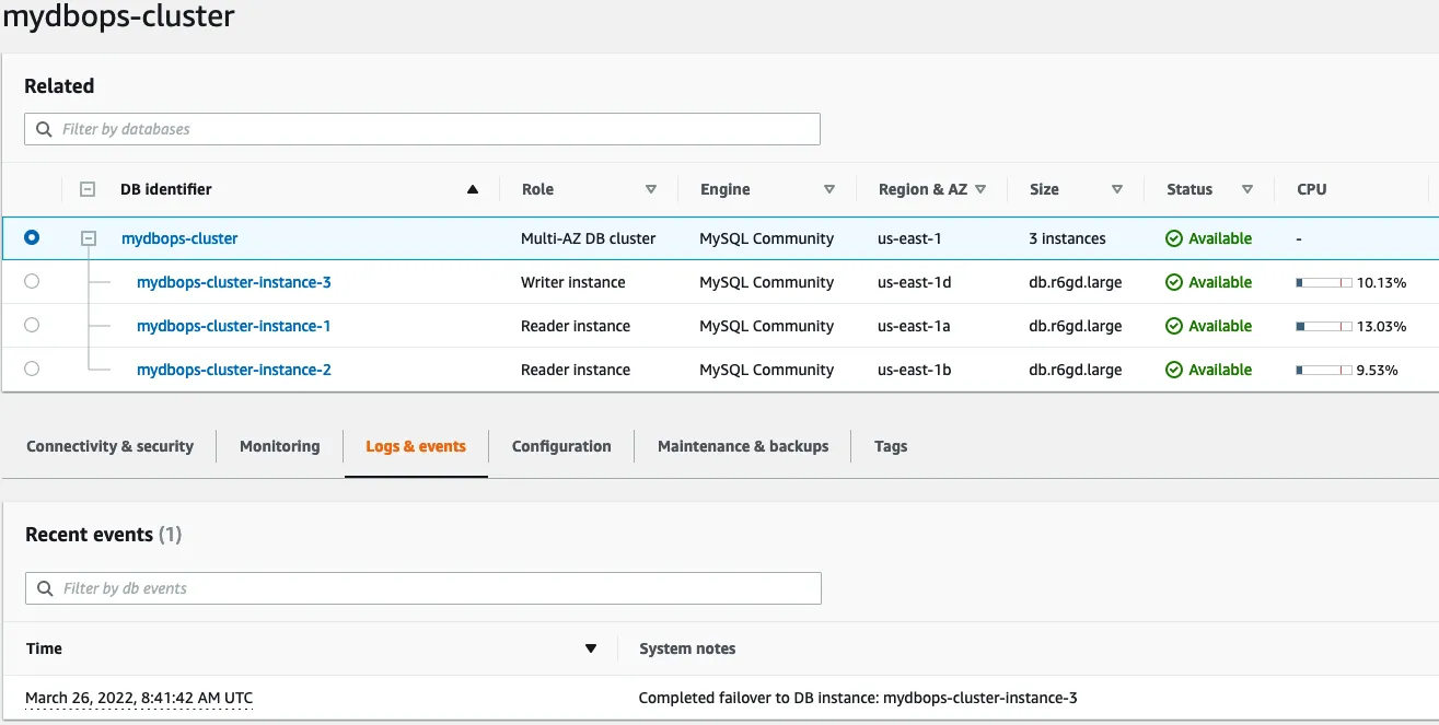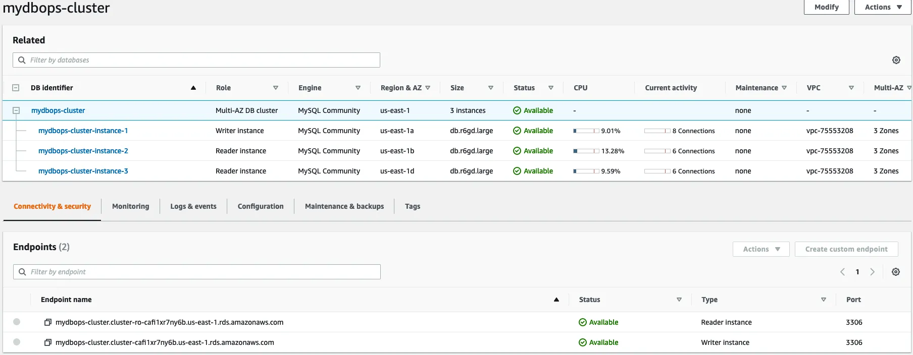 My cluster was available between 10 – 20 min, also you can see the 3 nodes are distributed in 3 availability zones. Similar to the Aurora cluster, the MultiAZ DB cluster also provides 3 end-points ie., Highly available cluster, read-only end-points, and individual instance end-point