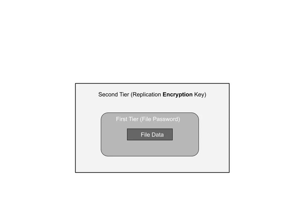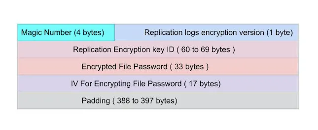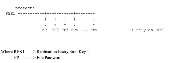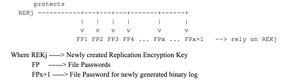 The server generates a new replication encryption key REKj and it iterates over all encrypted log files to re-encrypt their password (Iterate from the last file to the first file ) by overwriting the encrypted file header with the new one. So, my new encryption key can decrypt all the available file passwords.