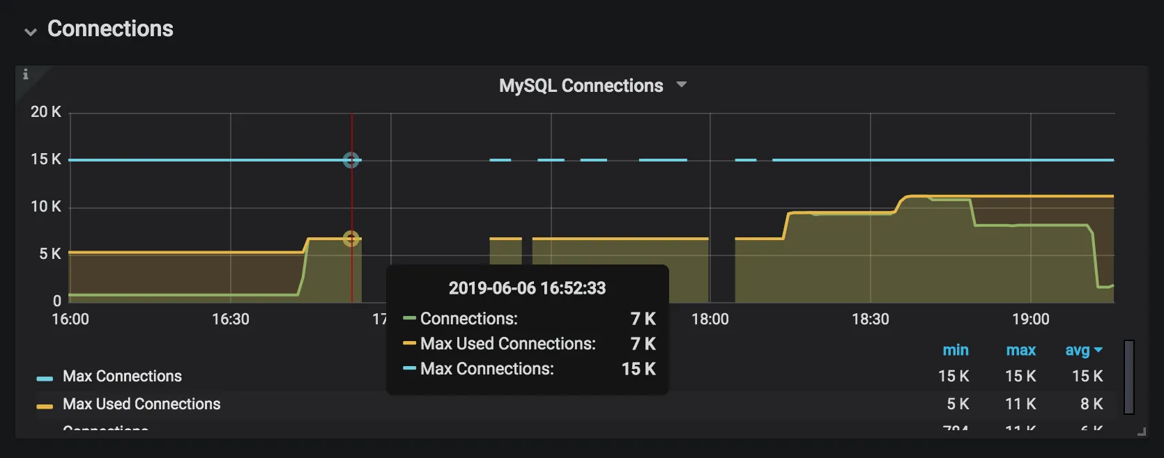 The connection limit (max_connections) was set in the DB servers as 15k . We were doing a series of test by increasing the no.of app boxes, which increases the number of threads connecting to MySQL Server. When the connection reach 6.5k to 7k mark we started to observer a few errors in the application log , mostly related to connections failures.