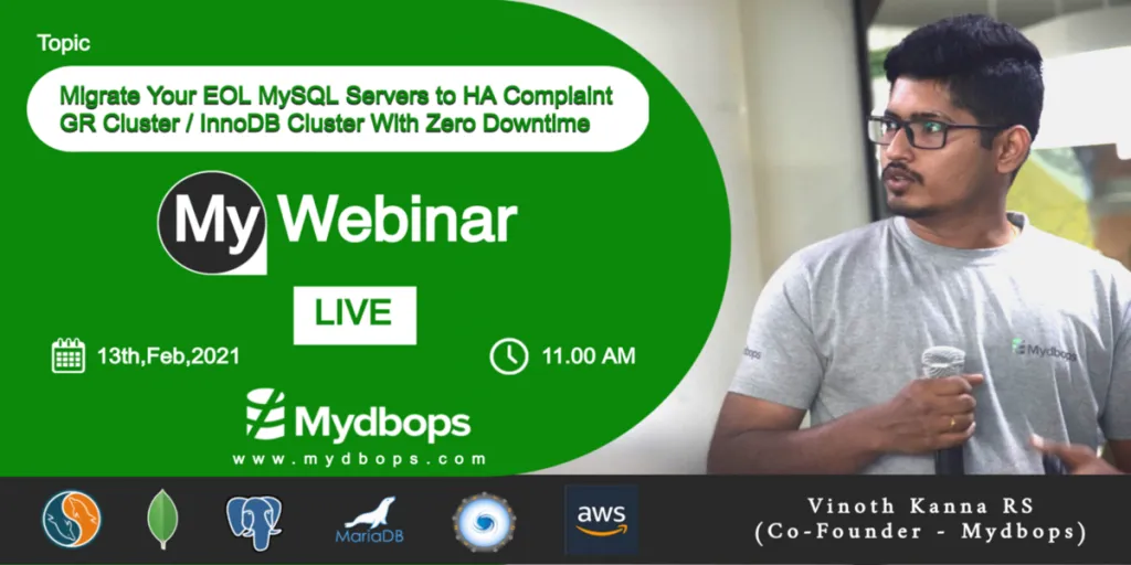 Over 30+ people took part in our webinar on 13th Feb 2021, to learn MySQL EOL and upgrade path. The session “Migrate your EOL MySQL servers to HA Complaint GR Cluster / InnoDB Cluster With Zero Downtime” by Vinoth Kanna Ramiya Sriram, Co-founder, Mydbops was able to elevate & seam your workmanship to perfection.