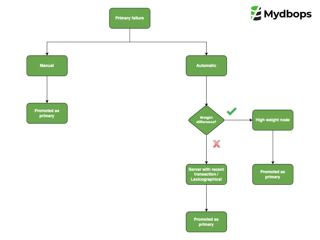 Manual Primary Promotion method: A method that requires manual intervention to promote a secondary node as the new primary. Once the new primary node is promoted, it will not be demoted back to a secondary node, even if the original primary node becomes available again. This approach gives more control to the database administrators and can be useful in certain scenarios where specific nodes need to be prioritized.